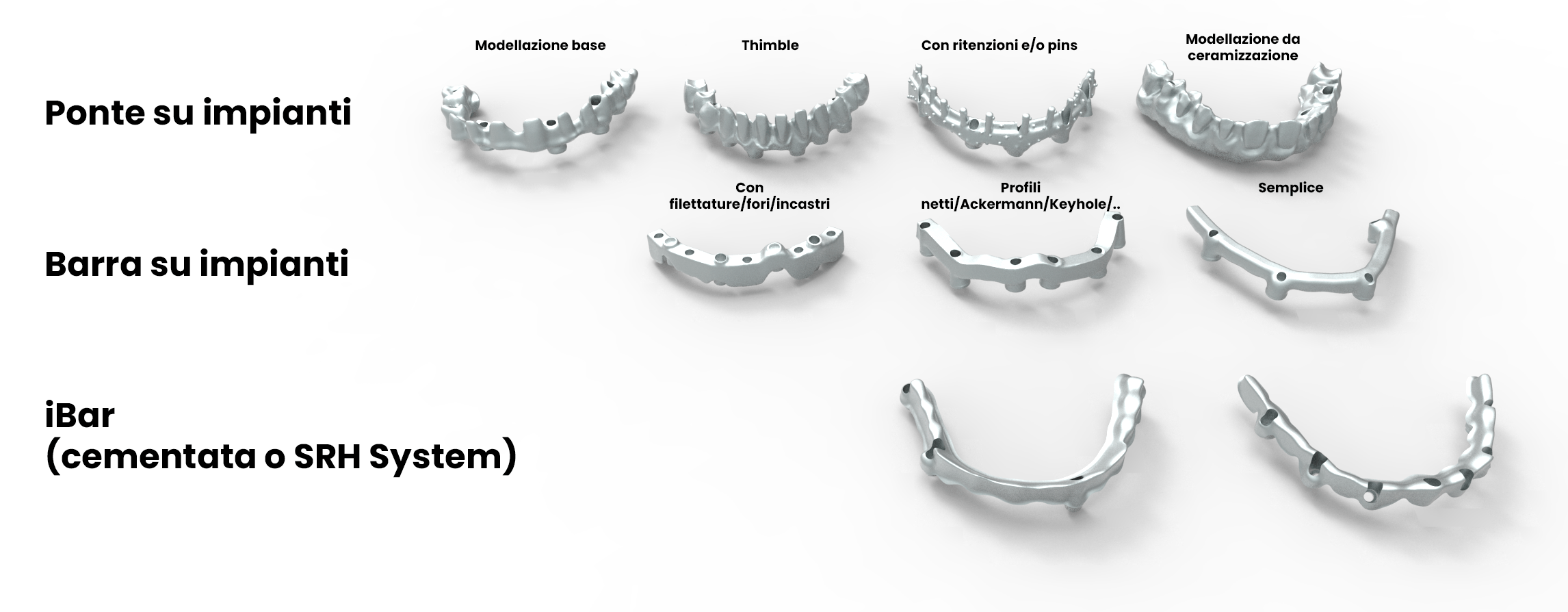 La nomenclatura commerciale o le diciture accademiche (“iBar”, o “Linea Duo”, “Implant Bridge” o “Toronto Bridge”, ecc), così come differenze estetiche o preferenze di stile di modellazione sono ininfluenti. La differenza la fa principalmente il numero di fasi di lavoro, il diametro e la quantità di frese coinvolte, particolare attenzione a certe superfici, strategia di taglio necessaria a garantire un buon risultato ecc.