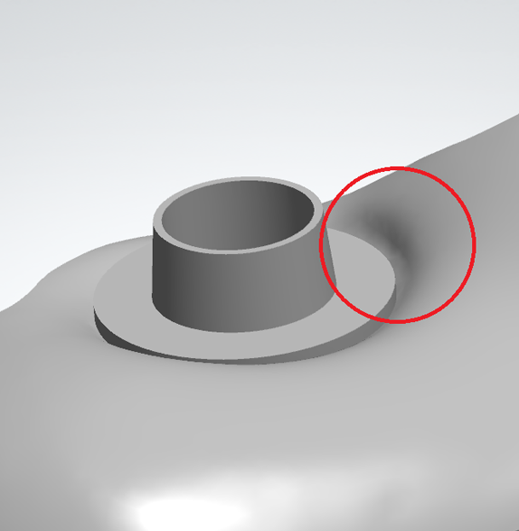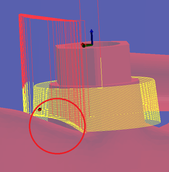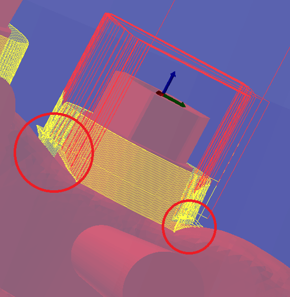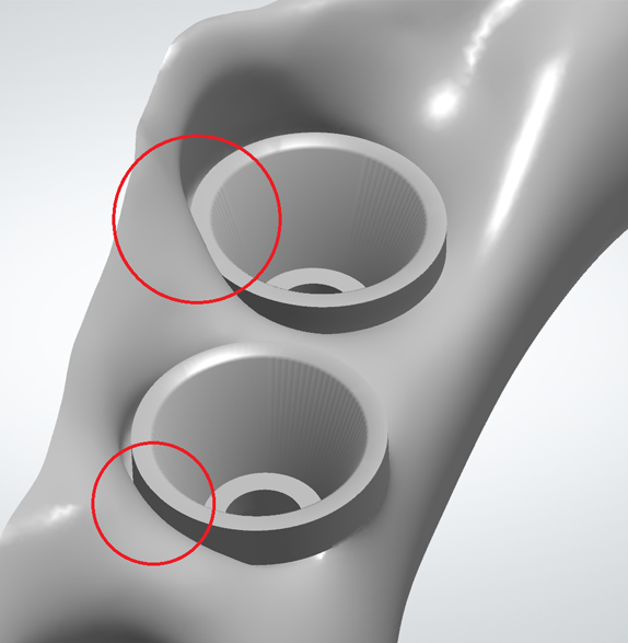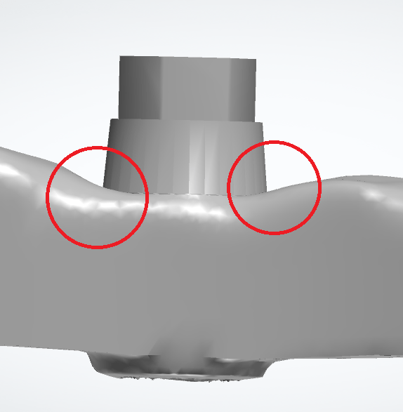 Se il file presenta delle connessioni prive di sufficiente spazio utile al passaggio delle frese (zona cerchiata) alcune parti della connessione non saranno riproducibili, con conseguente insoddisfacente fit del semilavorato protesico sulle fixture, sia sul modello sia nel cavo orale.