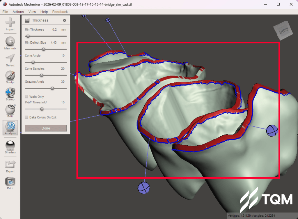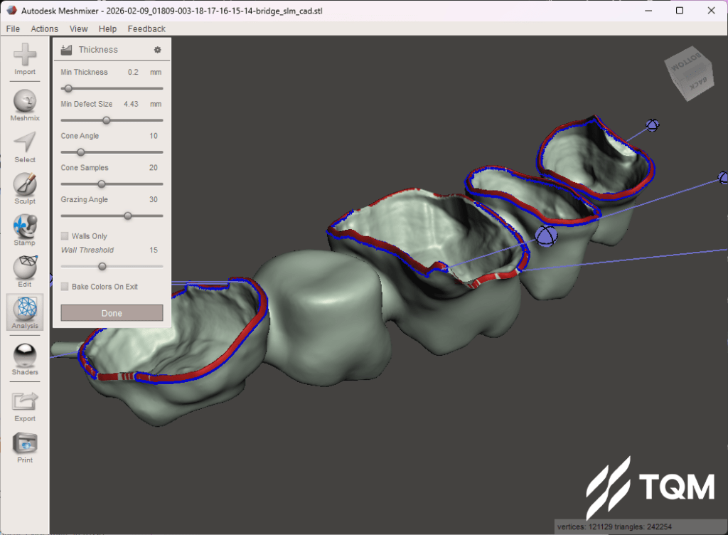 Strumenti di Analisi dello Spessore: Utilizzare sempre gli strumenti di analisi integrati nel software CAD per verificare che tutti i valori siano superiori ai minimi raccomandati. La maggior parte dei software moderni (3Shape, exocad, Blenderfordental, ...) include funzioni di color-mapping che evidenziano le aree critiche.